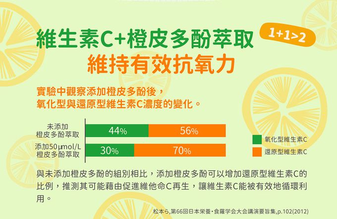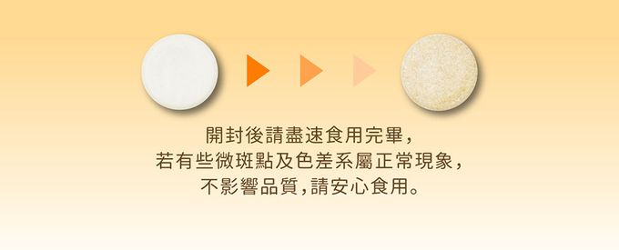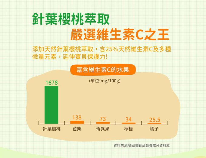 成分:糖粉、L-抗壞血酸鈉、L-抗壞血酸、硬脂酸鎂、針葉櫻桃萃取(含25%維生素C)、聚乙烯咯烷酮、酵母葡聚多醣、橙橘香料、Hesperidin橙皮萃取物