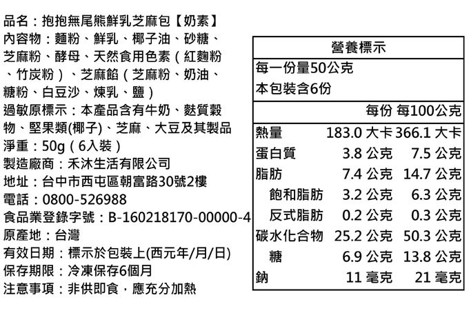 成分:麵粉、鮮乳、椰子油、砂糖、酵母、天然色素(紅麴粉、竹炭粉)、芝麻餡(芝麻粉、奶油、糖粉、白豆沙、煉乳、鹽)