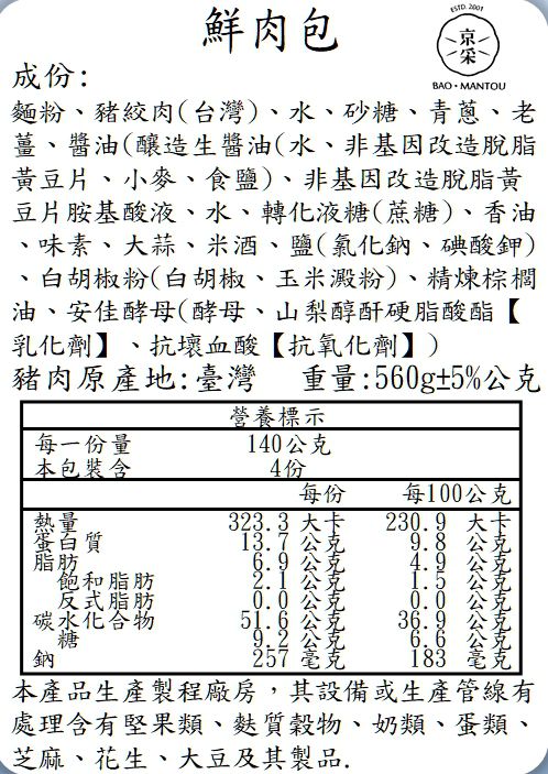 成分:麵粉、水、豬絞肉(台灣)、水、砂糖、青蔥、老薑、醬油(釀造生將由(水、非基因改造脫脂黃豆片、小麥、食鹽)、非基音改造脫脂黃豆片胺基酸液、水、轉化液糖(蔗糖)、香油、味素、大蒜、米酒、鹽(氯化鈉、碘酸鉀)、白胡椒粉(白胡椒、玉米澱粉)、精煉棕櫚油、酵母(酵母、山梨醇酐硬脂酸酯【乳化劑】、抗壞血酸【抗氧化劑】)