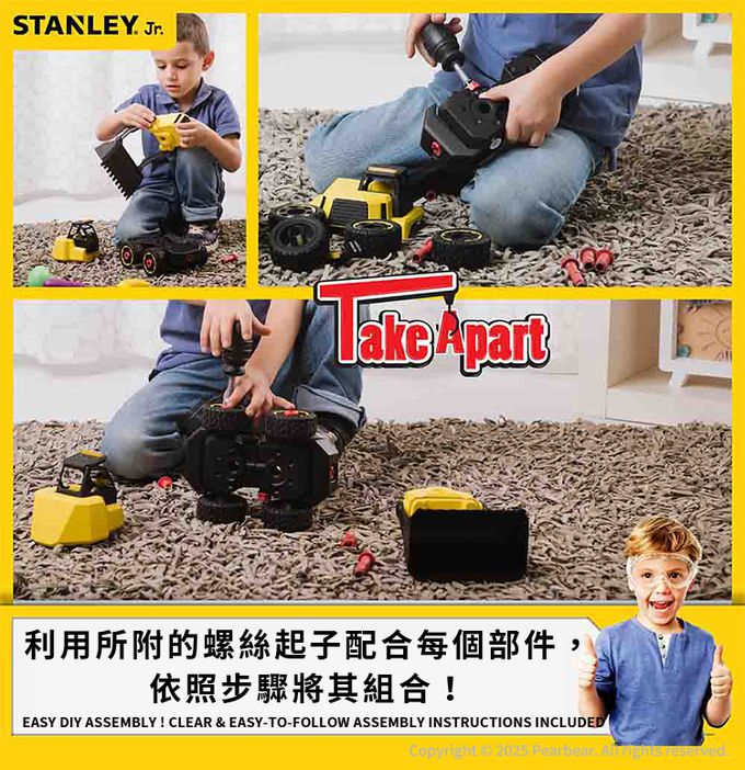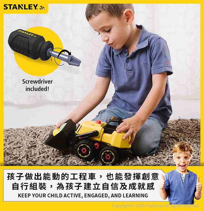 【STANLEYJr】工程車所有的零件包括輪子、車頭、底座,都是可以拆解的,孩子可以練習使用螺絲起子把車子組裝起來,除了可以更了解每一台車的構造之外,在組裝過程中也能提升解決問題的能力