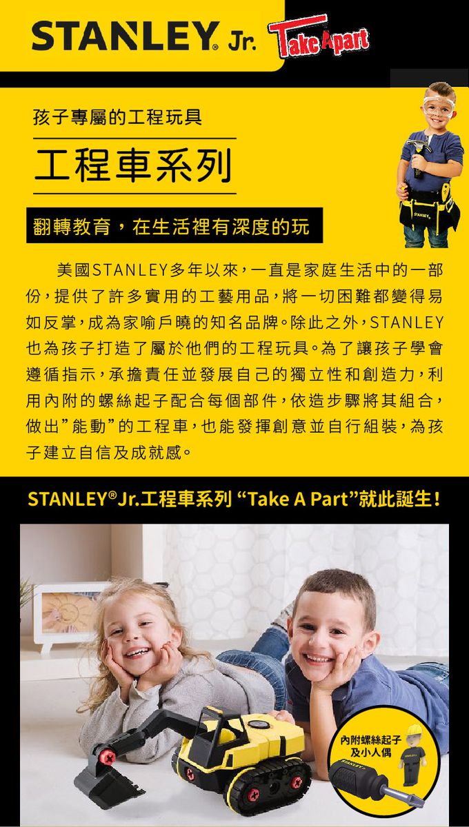 除了電動工具之外,近年來STANLEY也為孩子打造了專屬兒童的工程玩具!孩子最愛的工程車加上STANLEY的經典黃黑配色,「STANLEY Jr.」就此誕生!
