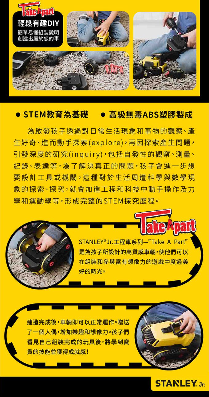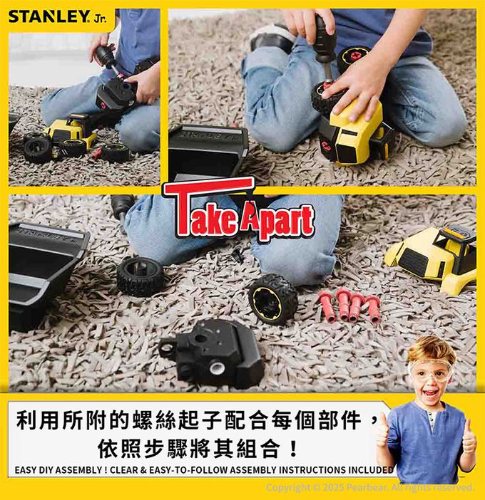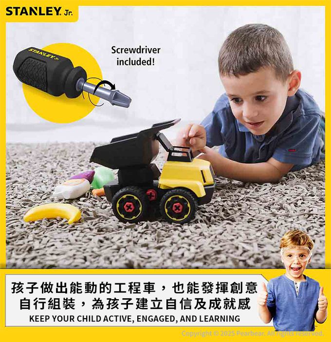 【STANLEYJr】工程車所有的零件包括輪子、車頭、底座,都是可以拆解的,孩子可以練習使用螺絲起子把車子組裝起來,除了可以更了解每一台車的構造之外,在組裝過程中也能提升解決問題的能力