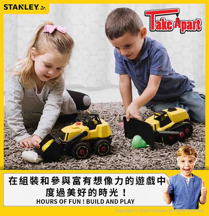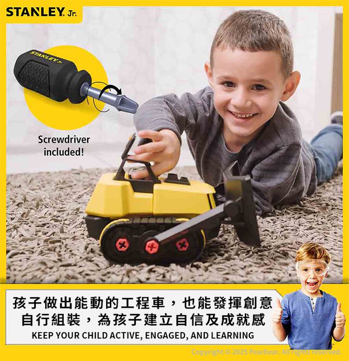 【STANLEYJr】工程車所有的零件包括輪子、車頭、底座,都是可以拆解的,孩子可以練習使用螺絲起子把車子組裝起來,除了可以更了解每一台車的構造之外,在組裝過程中也能提升解決問題的能力
