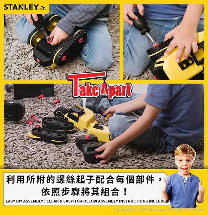【STANLEYJr】工程車所有的零件包括輪子、車頭、底座,都是可以拆解的,孩子可以練習使用螺絲起子把車子組裝起來,除了可以更了解每一台車的構造之外,在組裝過程中也能提升解決問題的能力