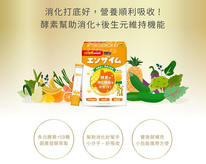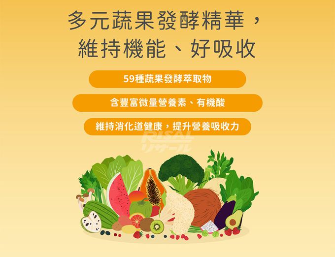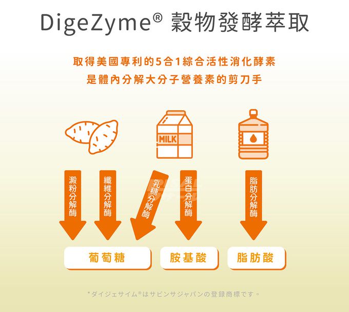 成分:海藻糖、植物發酵萃取乾燥粉末(糊精、植物發酵物(昆布、海藻、海苔、高麗菜、地瓜、松茸、蓮藕、牛蒡、番茄、青椒、甜菜、紅椒、紅蘿蔔、白蘿蔔、藜麥、玄米、燕麥、玉蜀黍、大麥、豌豆、紅豆、巴西豆、紫巴西豆、黑芝麻、黃豆、黑巴西豆、鷹嘴豆、小扁豆、薏苡、乾玉米、棉籽油、迷迭香、明日葉、黑醋栗、檸檬草、肉桂、甜菊葉、瓜拿那、橘子、鳳梨、香蕉、蘋果、青木瓜、芭樂,哈密瓜、酪梨、黑棗乾,西印度櫻桃、葡萄乾、芒果、楊桃,西瓜,奇異果,西洋梨、卡姆果))、米麴發酵粉末、穀物發酵萃取DigeZyme☆ (穀物發酵萃取物(麥麩,含澱粉酶、乳糖酶、脂肪酶、纖維素酶、中性蛋白酶) 、麥芽糊精)、磷酸鈣、果寡糖、檸檬酸