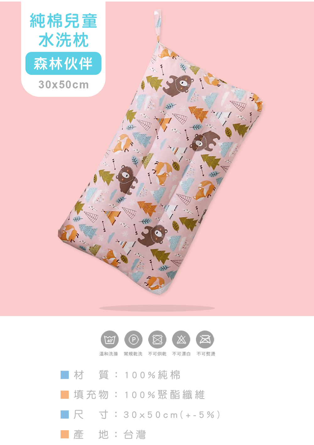 純棉可水洗抑菌兒童枕-森林伙伴 (30x50cm)-1入