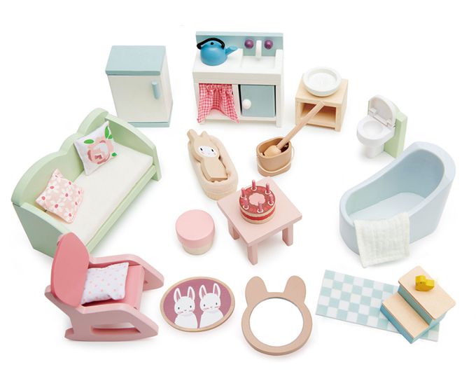 柔和色彩的鄉村主題娃娃屋入門家具組,包含:沙發床、搖椅、3 個印花枕頭、桌子、小凳子、生日蛋糕、腳踏凳、玩具鴨、冰箱、2 個水槽、水壺、浴缸、墊子、毛巾、馬桶、拖把和水桶、兔兔相片、兔子鏡 、 嬰兒床和小兔娃。