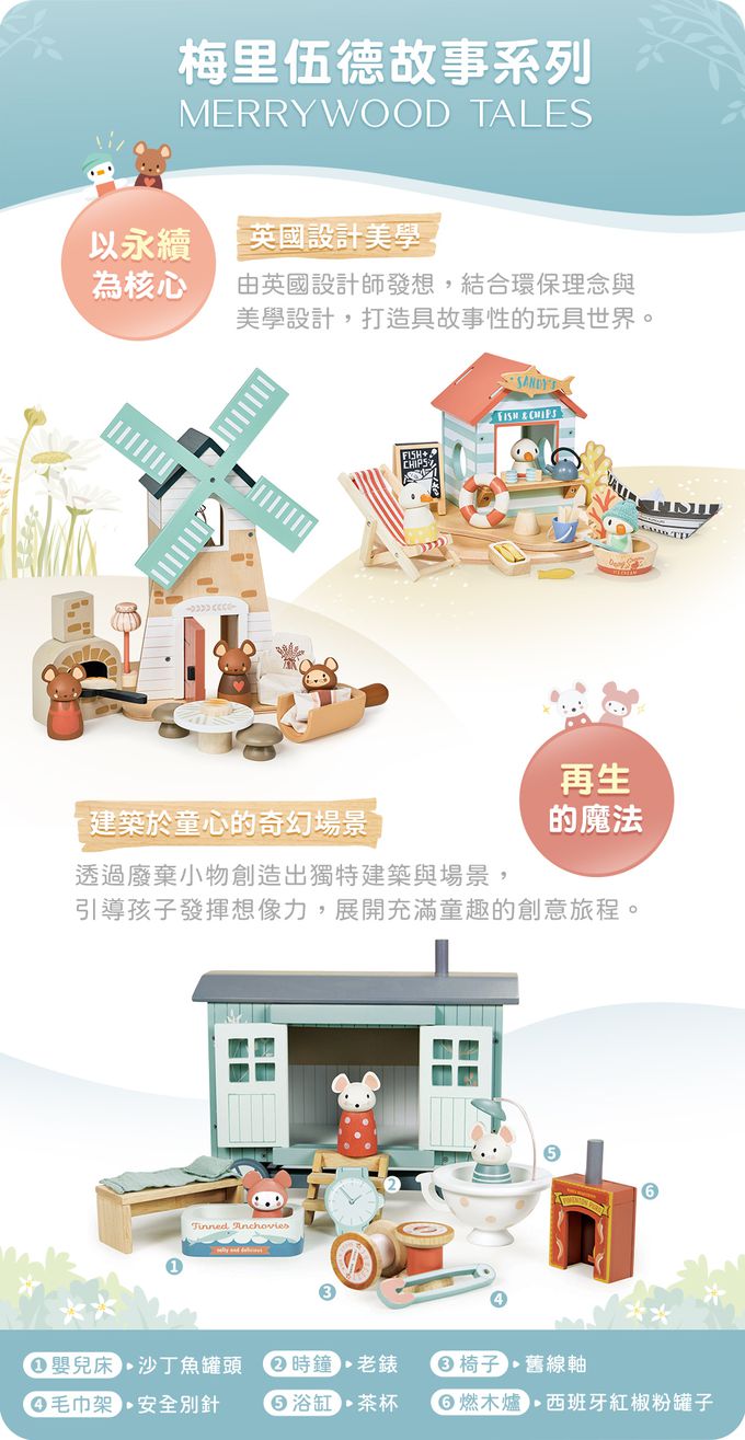 〈Merrywood Tales〉由英國設計師以永續環保為故事發想,透過小人物和小動物運用廢棄小物創造出各種獨特的建築與場景,知足而滿足。這些玩具不僅啟發孩子的創造力與想像力,也傳遞愛護地球的理念,是寓教於樂的最佳選擇。