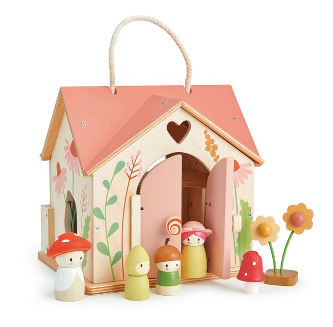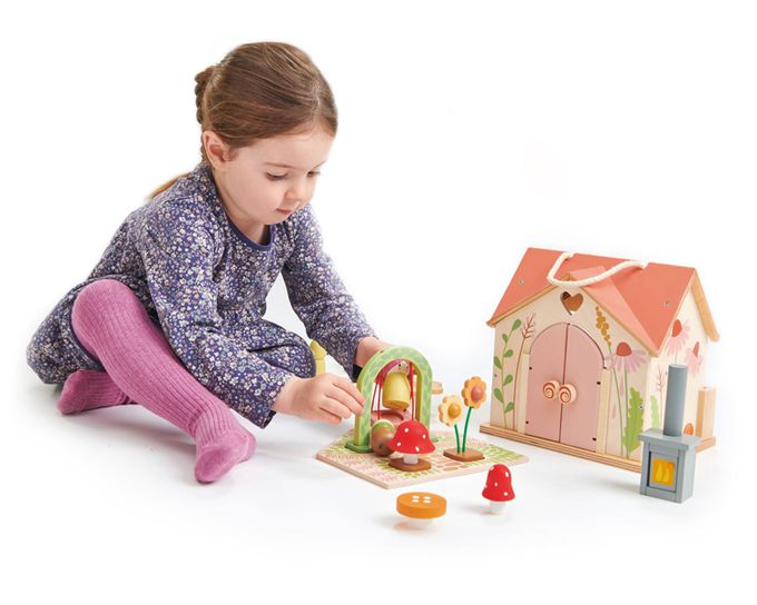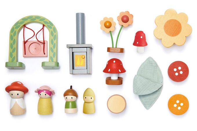 🌿四面擁有美麗的野花圖藤裝飾,還有兩扇鏤空的窗戶,讓花莖貫穿其中,營造出神奇的草甸蔓生景觀。後背板平放後則成為一座花園,上面可以放置漂亮的鞦韆,2朵花和一個蘑菇凳子。裏頭還包含一個燒木爐、花桌、2個鈕扣凳、一盞蘑菇燈和一張桌几。提把設計,遊戲中促進肌肉精細運動的發展,激盪孩子的想像力與應變能力:把花苞寶寶Bud抱進他的布藝床,或推著 Corny 盪鞦韆,而媽媽Flora和爸爸Joey 則在一旁看星星!