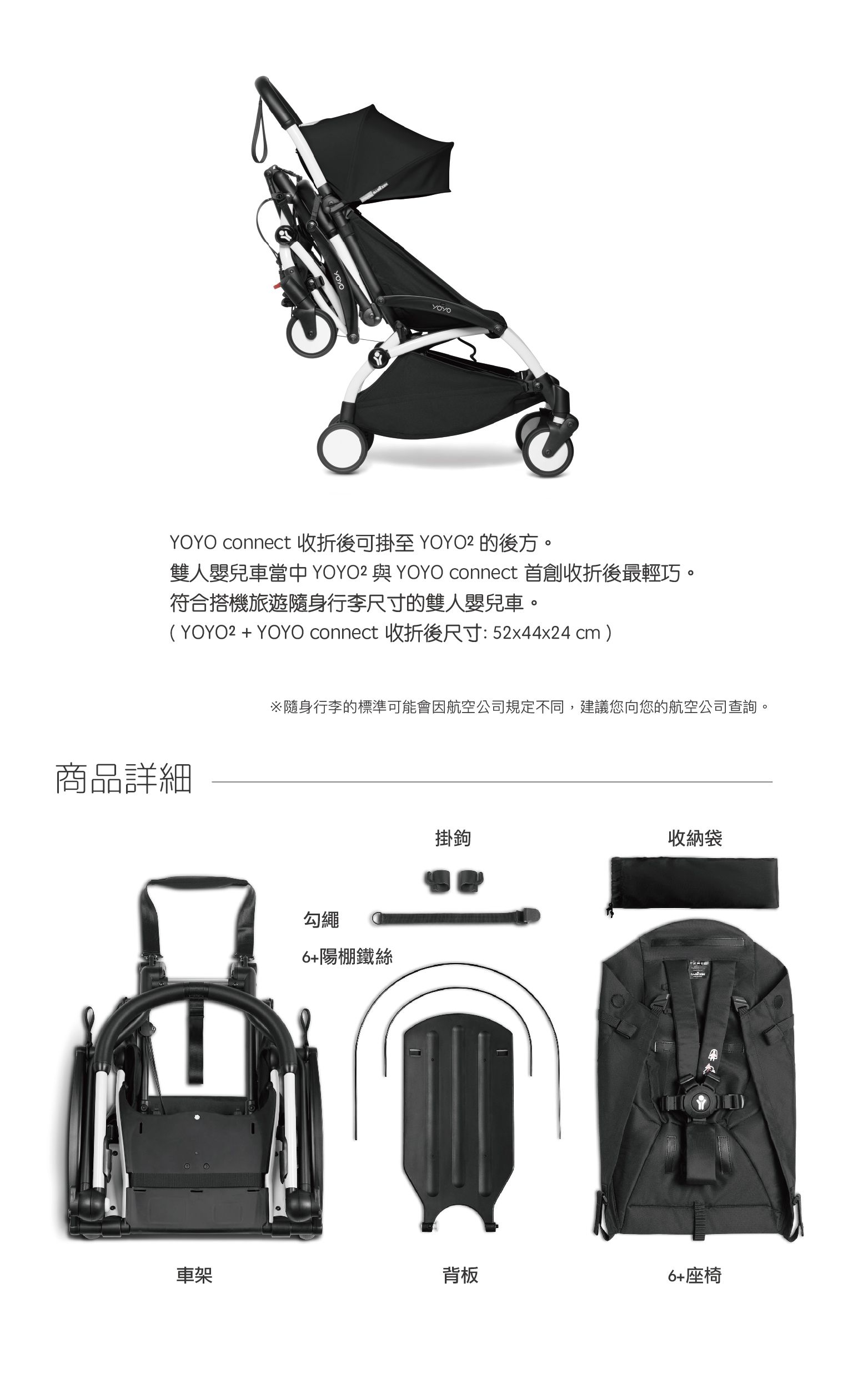 符合搭機旅遊隨身行李尺寸的雙人嬰兒車(隨身行李的標準可能因航空公司規定不同,建議向您的航空公司查詢)