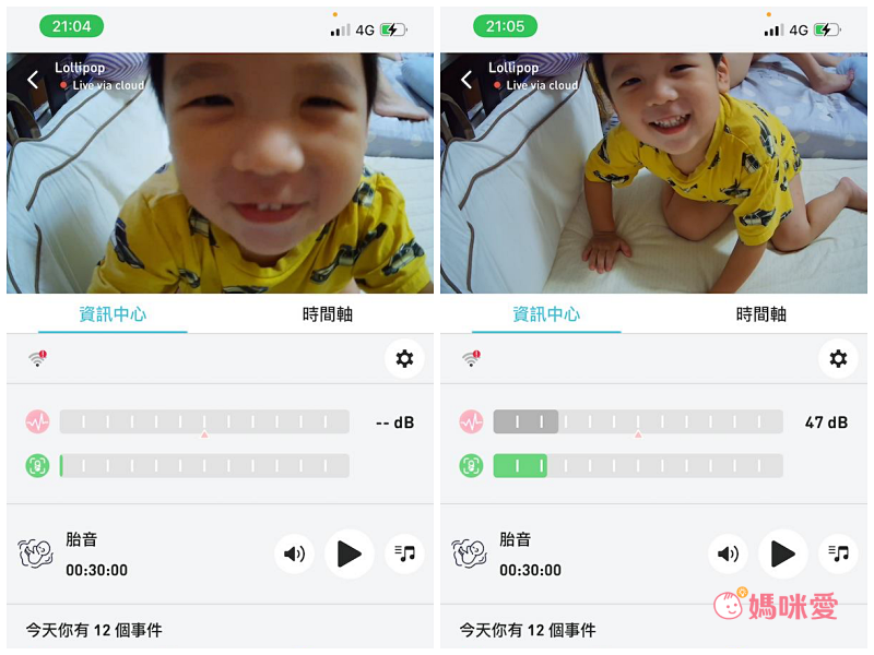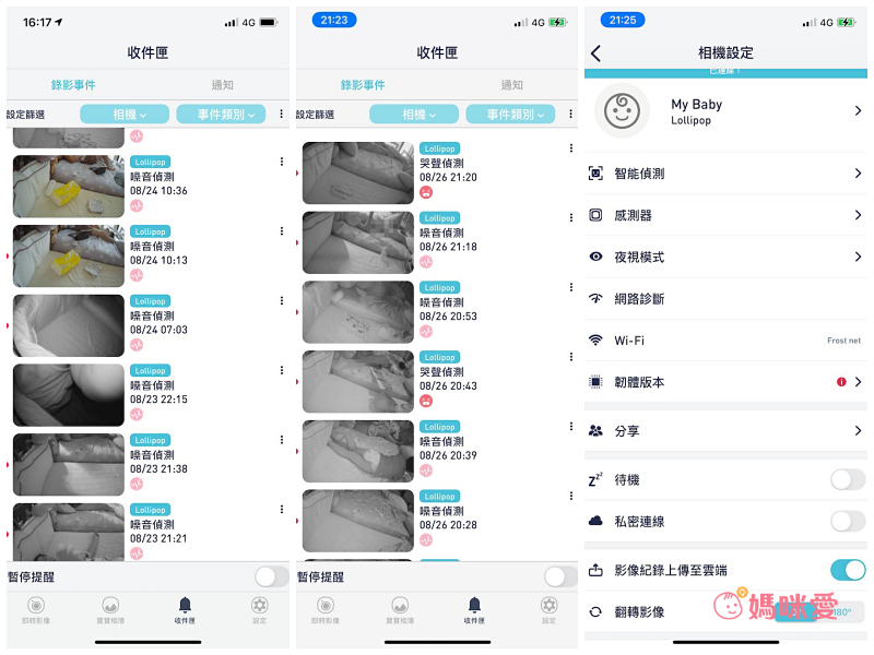 在收件匣中,可以看到 Lollipop 嬰兒監視器會偵測房間內的噪音以及哭聲,自動錄製30秒的畫面,並即時傳送通知訊息到手機中,可以快速了解寶寶的狀態;影片也可以在手機直接下載,非常方便!另外,在 App的設定頁中,可以將同一個Lollipop相機透過分享功能,分享給其他家庭成員,讓大家都可以看到阿屁的即時畫面。像是便爸在台南工作,只有假日才會回家,他就經常使用Lollipop看看阿屁的狀況,一解他想兒子的鄉愁~