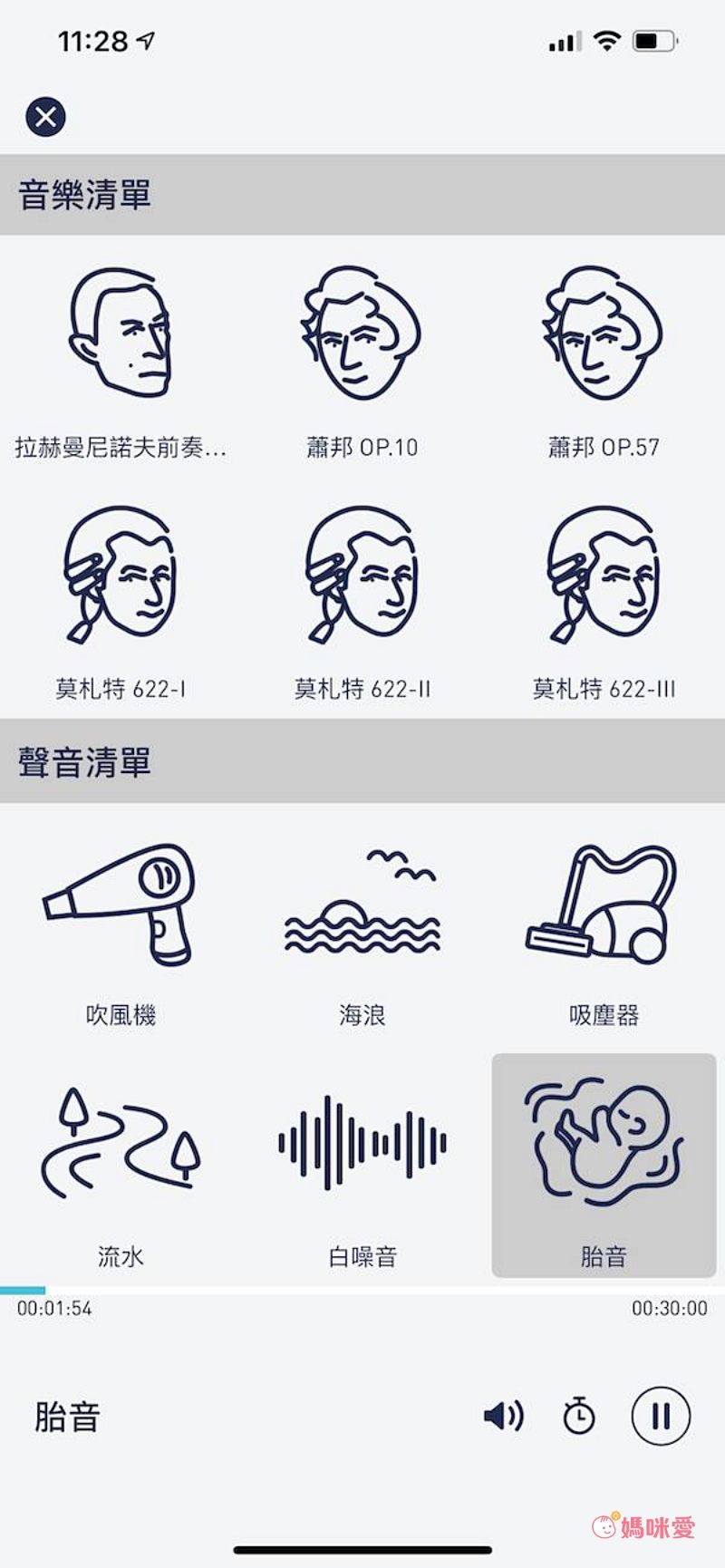 便媽也很喜歡它內建的哄睡音樂,包括拉赫曼尼諾夫、蕭邦、莫札特以及許多日常的白噪音,讓阿屁可以安心睡眠。遙想以前照顧大寶阿便時,都是手機開一整個晚上的水晶音樂,自己也不小心睡著,現在可以直接利用Lollipop播放音樂,終於不用再不斷摧殘手機了啊XD