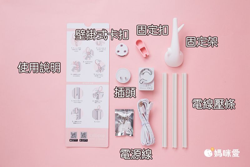 所附的配件十分齊全,包含固定架、電源插頭、電源線、電線壓條,還有印有APP QR code的使用說明。固定架是樹枝的形狀呢!看起來又可愛又特別~還有附贈電線壓條,不用擔心寶寶拉扯電線而發生危險啦~