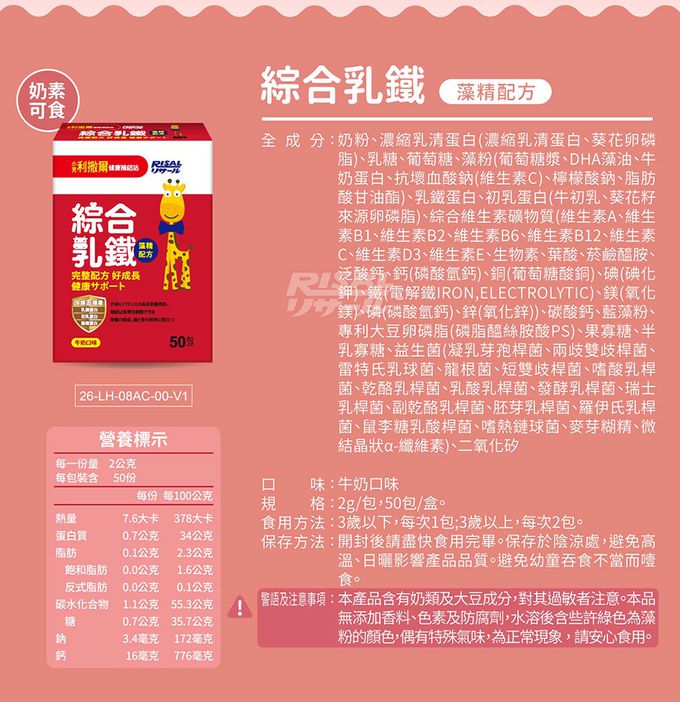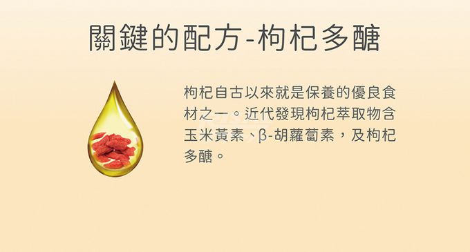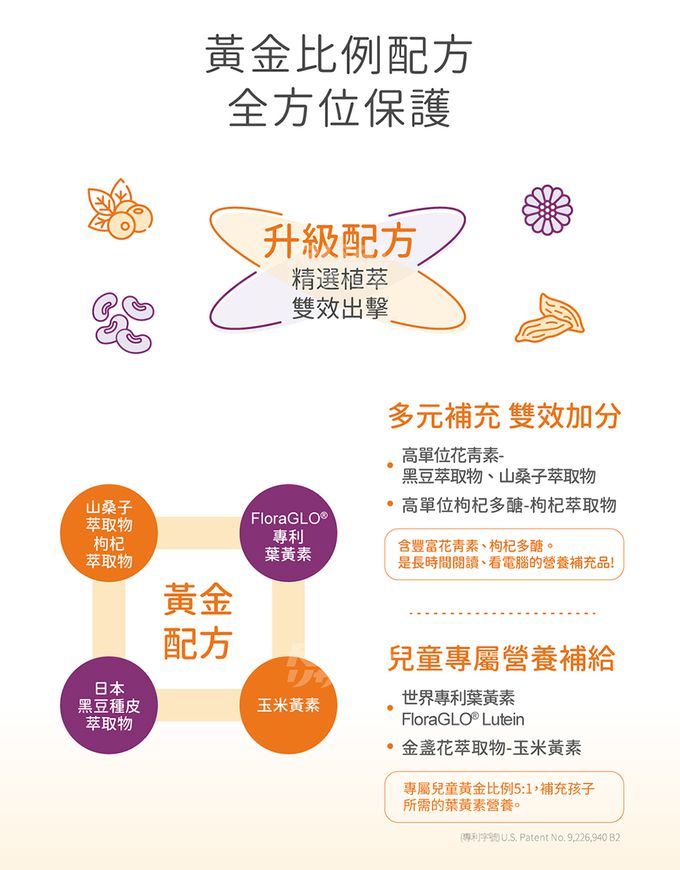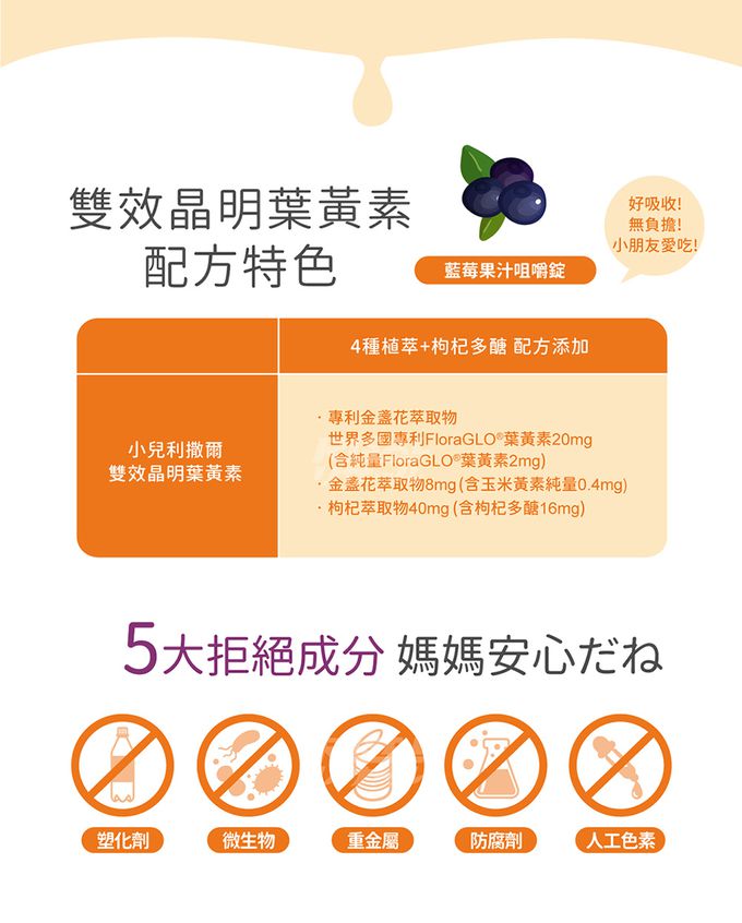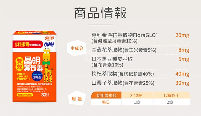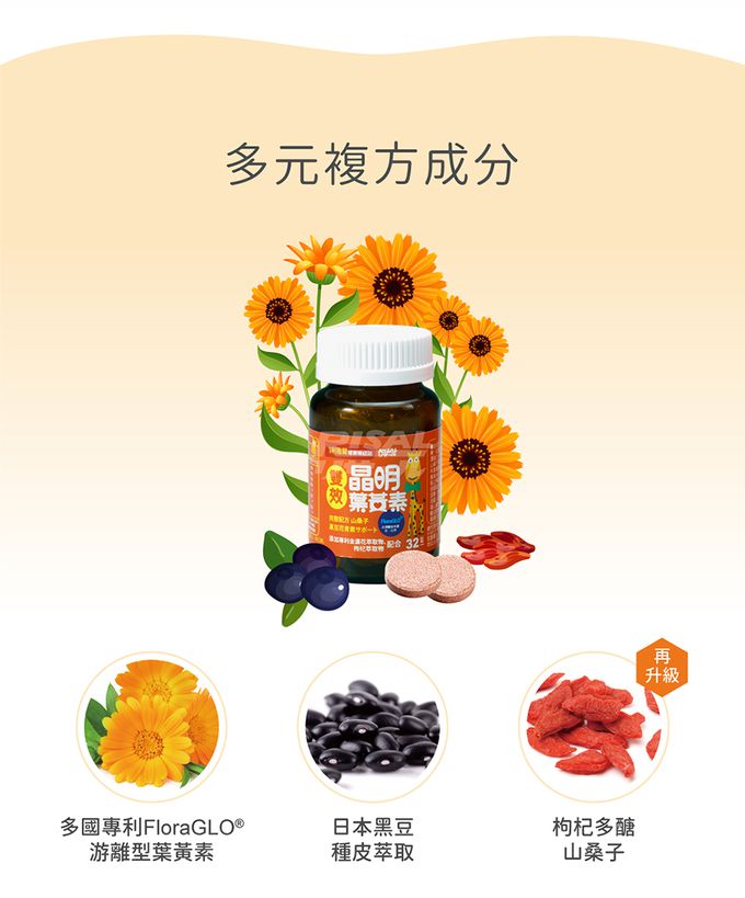 葡萄糖、乳糖、紅葡萄果汁粉(麥芽糊精、紅葡萄濃縮汁、阿拉伯膠)、藍莓果汁粉(藍莓濃縮汁、麥芽糊精)、枸杞萃取物(枸杞多醣40%)(枸杞萃取物、麥芽糊精)、山桑子萃取物(含花青素25%)、FloraGLO® 葉黃素10%(葉黃素、辛烯基丁二酸鈉澱粉、乾燥葡萄糖漿、蔗糖、L-抗壞血酸鈉(抗氧化劑))、硬脂酸鎂、金盞花萃取物(玉米黃素5%)(金盞花、麥芽糊精)、檸檬酸、黑大豆種皮萃取物(含10%花青素)、聚乙烯吡咯烷酮