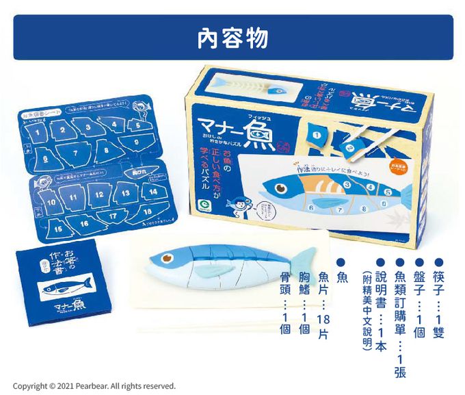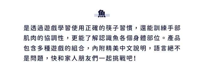 EyeUp是日本專門設計可愛以及紓壓玩具的品牌,所創作的可愛商品都擁有許多各式不同的玩法及趣味性。魚 - 是透過遊戲學習使用正確的筷子習慣,還能訓練手部肌肉的協調性,更能了解認識魚各個身體部位。產品包含多種遊戲的組合,適合全家大小一起挑戰。