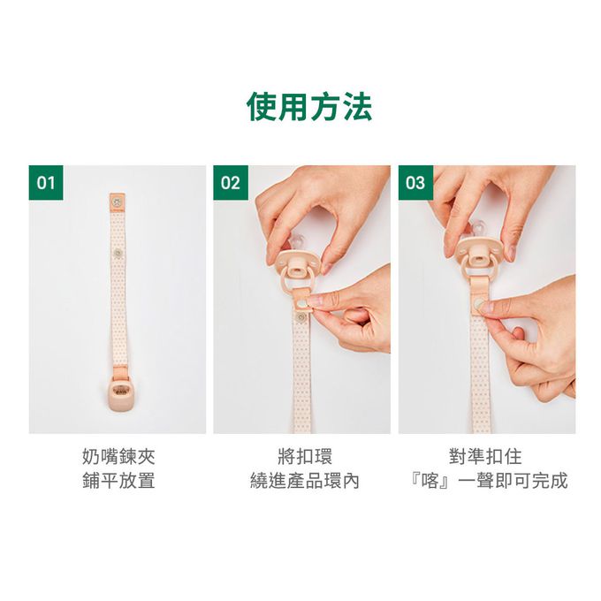 -使用時,奶嘴鍊夾請僅固定於寶寶衣物上,不得加長或連接至繩帶、絲緞帶、編織袋、衣物鬆脫處等物品,以避免兒童勒頸風險。