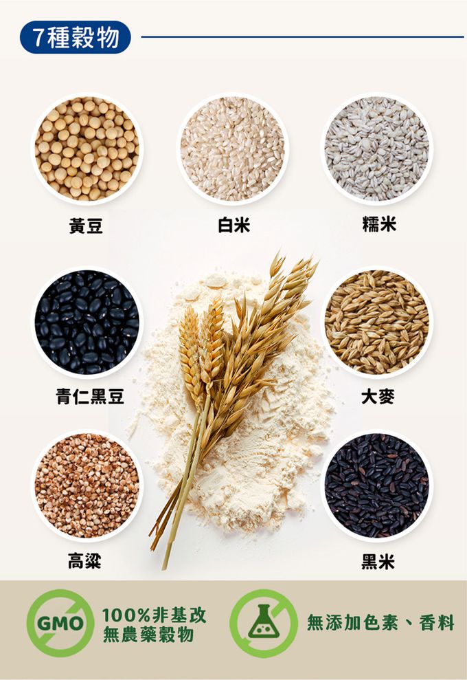 成分:7種混合穀物(白米,糯米,大麥,黑米,高粱,青仁黑豆,黃豆),植物油(棕櫚油),香蕉粉(香蕉),玉米粉(玉米),脫脂奶粉(脫脂牛奶),蔗糖(紅糖,玉米澱粉),葡萄糖,濃縮初乳乳清蛋白,碳酸鈣,混合濃縮生育醇,氧化鋅
