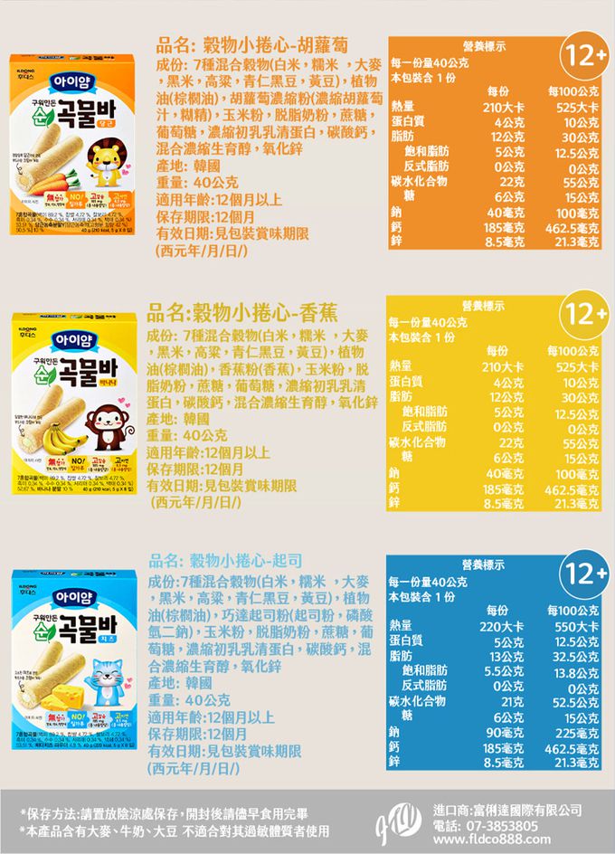 成分:7種混合穀物(白米,糯米,大麥,黑米,高粱,青仁黑豆,黃豆),植物油(棕櫚油),巧達起司粉(起司粉,磷酸氫二鈉),玉米粉(玉米),脫脂奶粉(脫脂牛奶),蔗糖(紅糖,玉米澱粉),葡萄糖,濃縮初乳乳清蛋白,碳酸鈣,混合濃縮生育醇,氧化鋅
