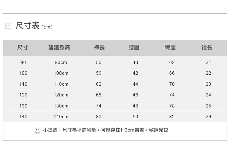 尺寸表皆為水平測量,會因布料彈性、水洗處理、測量起訖點等因素, 與實際商品尺寸略有誤差。