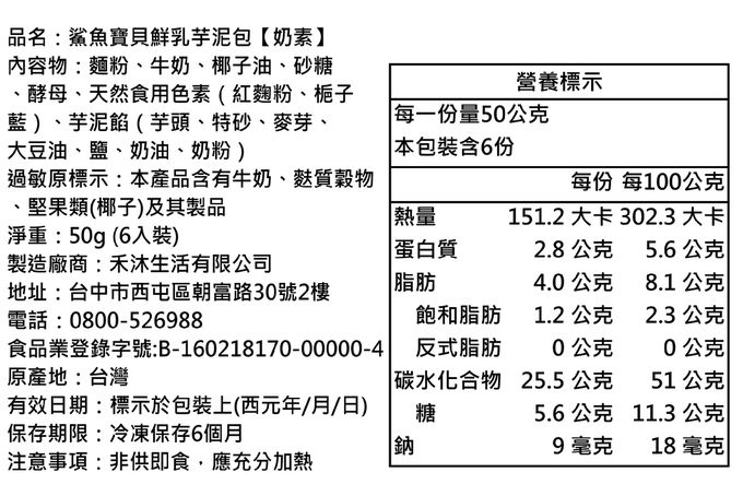 鯊魚寶貝鮮乳芋泥包-6入-50g/顆