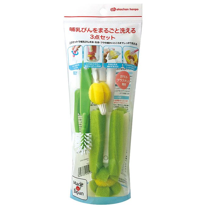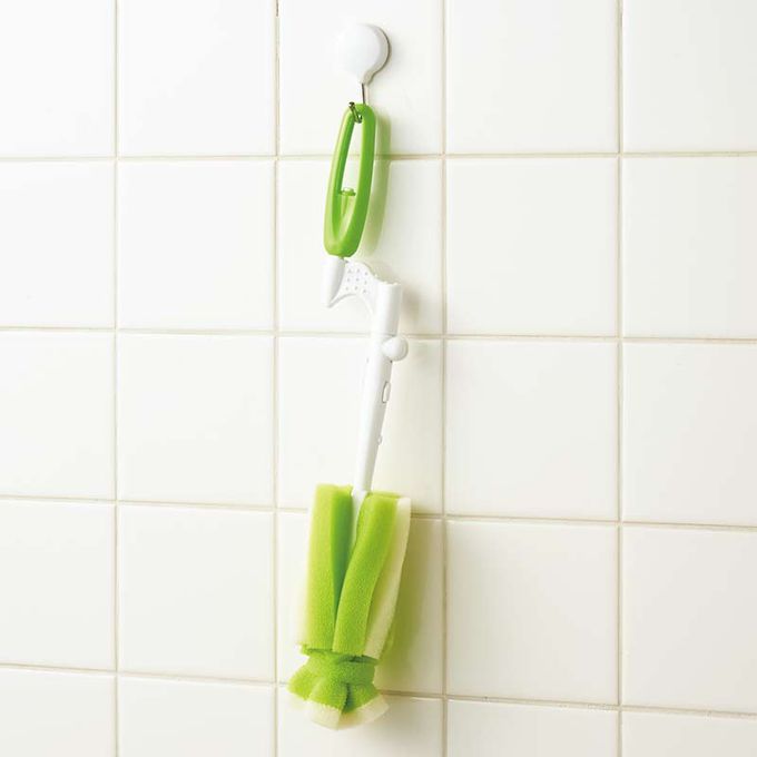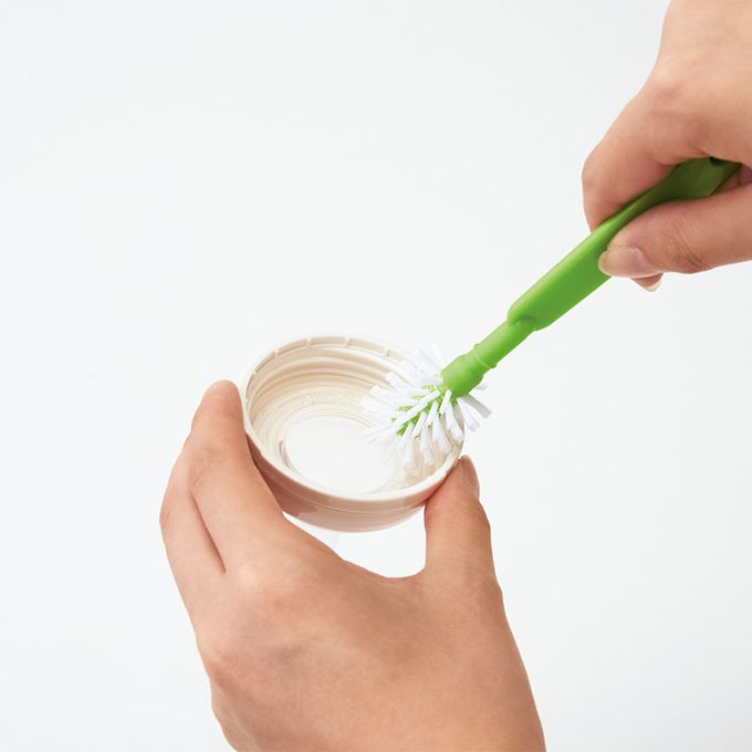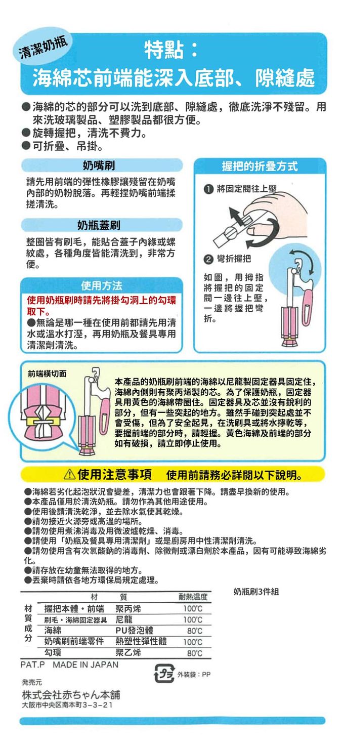 材質握把、前端零件:聚丙烯 刷毛、固定海棉的器具:尼龍 海棉:聚氨酯發泡材 奶嘴刷前端零件:熱塑性彈性體 勾環:聚乙烯