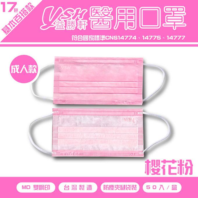 YSH 益勝軒 - 成人醫療級三層平面口罩/滿版/雙鋼印/台灣製-櫻花粉 (17.5x9.5cm)-50入/盒(未滅菌)