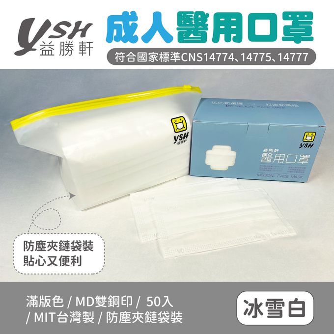 成人醫療級三層平面口罩/滿版/雙鋼印/台灣製-冰雪白 (17.5x9.5cm)-50入/盒(未滅菌)