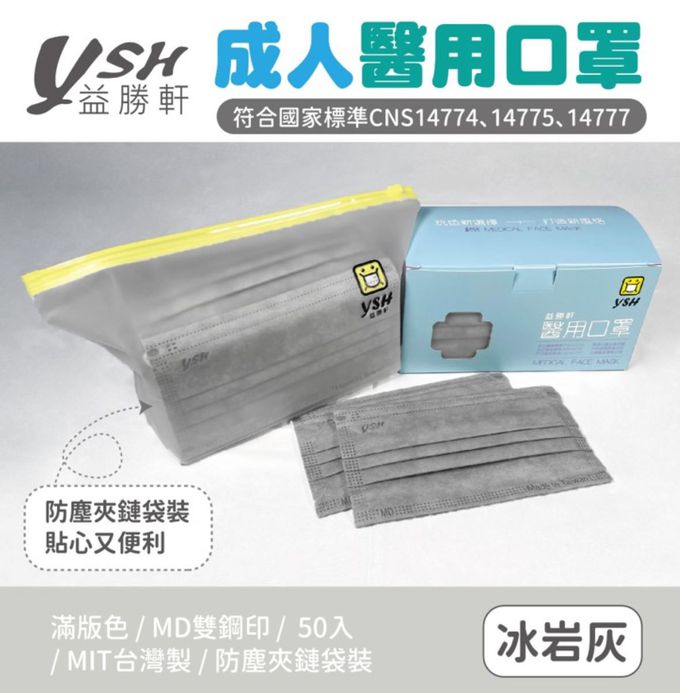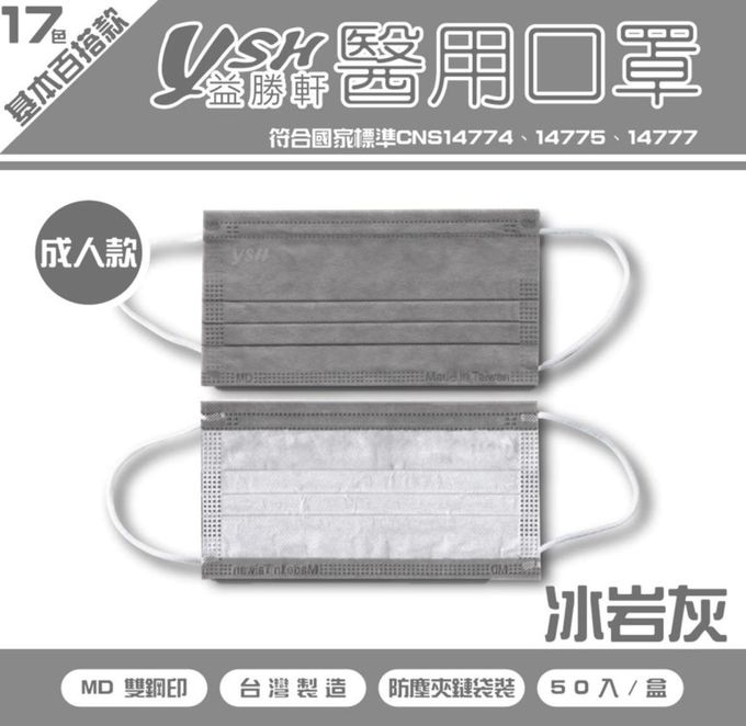 成人醫療級三層平面口罩/滿版/雙鋼印/台灣製-冰岩灰 (17.5x9.5cm)-50入/盒(未滅菌)