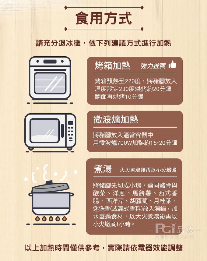 豬腳(荷蘭)、洋蔥、紅蘿蔔、西洋芹、鹽、糖、薑、蒜仁、巴西里葉、月桂葉、黑胡椒粒、花椒粒、多磷酸鈉(結著劑) 、味素(調味劑)、異抗壞血酸鈉(抗氧化劑)、亞硝酸鹽(保色劑)