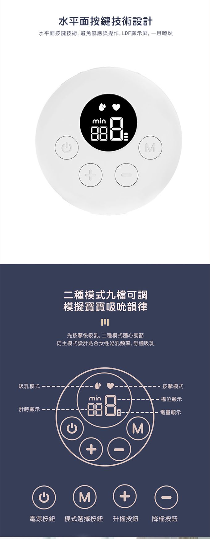 2.M為模式切換鍵,水滴圖示代表吸乳模式,有9檔吸力強弱可使用+-調節;愛心圖示為按摩模式,有9檔可+-調節,每個檔位會有9次的短吸短放和一次長吸長放的循環。