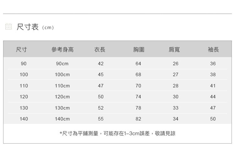 • 尺寸表皆為水平測量,會因布料彈性、水洗處理、測量起訖點等因素, 與實際商品尺寸略有誤差。