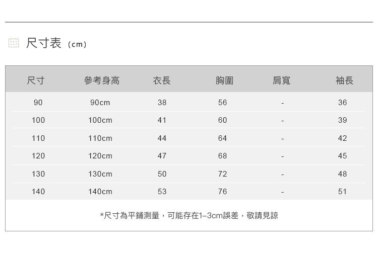 • 尺寸表皆為水平測量,會因布料彈性、水洗處理、測量起訖點等因素, 與實際商品尺寸略有誤差。