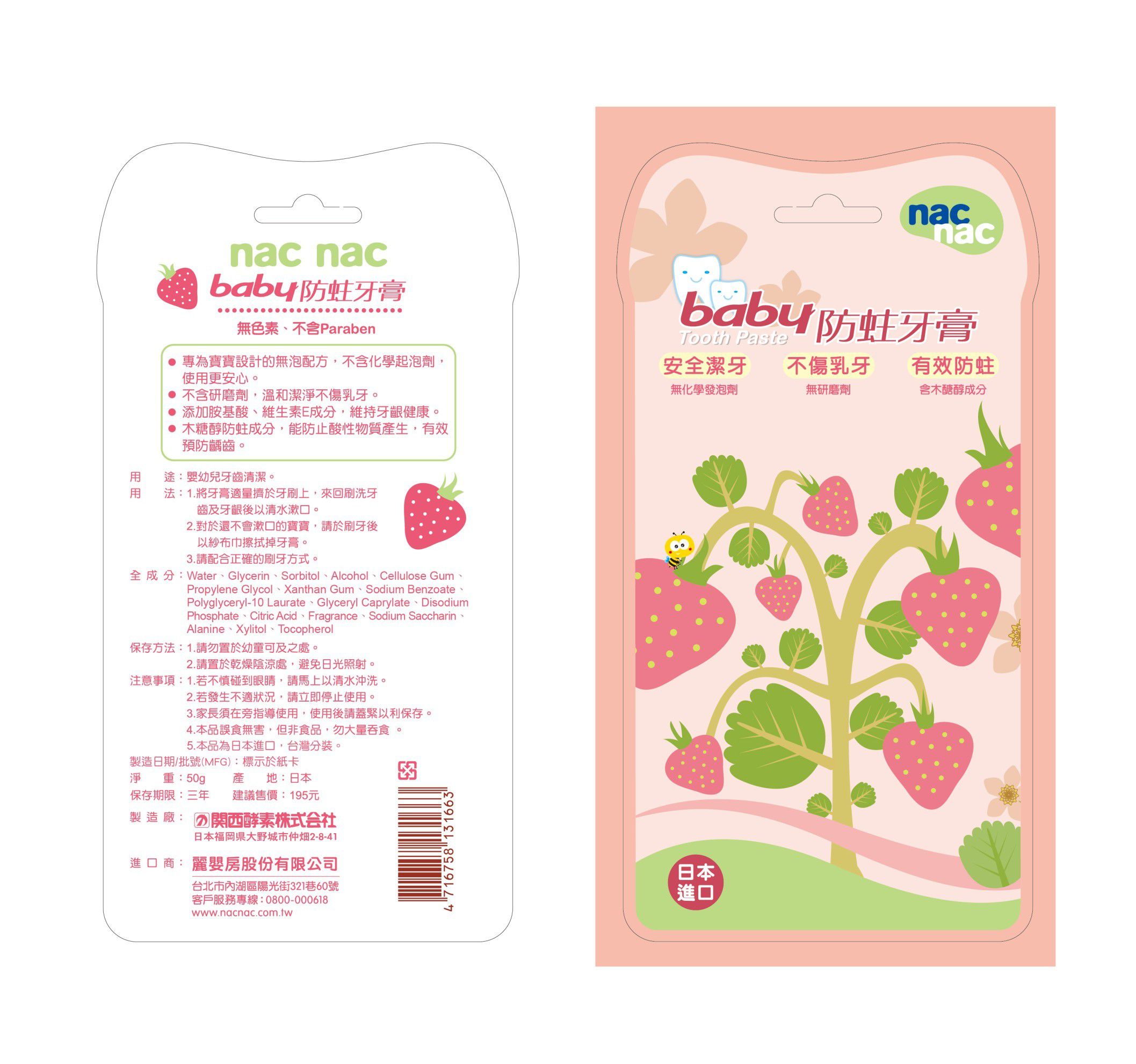 日本進口Baby防蛀牙膏草莓口味專為6個月以上嬰幼兒所設計,100%食品用料,寶寶誤食無害,溫和潔淨的配方添加胺基酸、維生素E成分,維持牙齦健康~含木糖醇,能防止酸性物質產生,有效預防齲齒唷!不含研磨劑,不傷害寶寶新生的乳牙,非常適合拿來教寶寶如何自己刷牙~只要將牙膏適量擠於牙刷上,配合正確的刷牙方式,來回刷洗牙齒及牙齦後以清水漱口即可喔~ 對於還不會漱口的寶寶,請於刷牙後以紗布巾擦拭掉牙膏^^