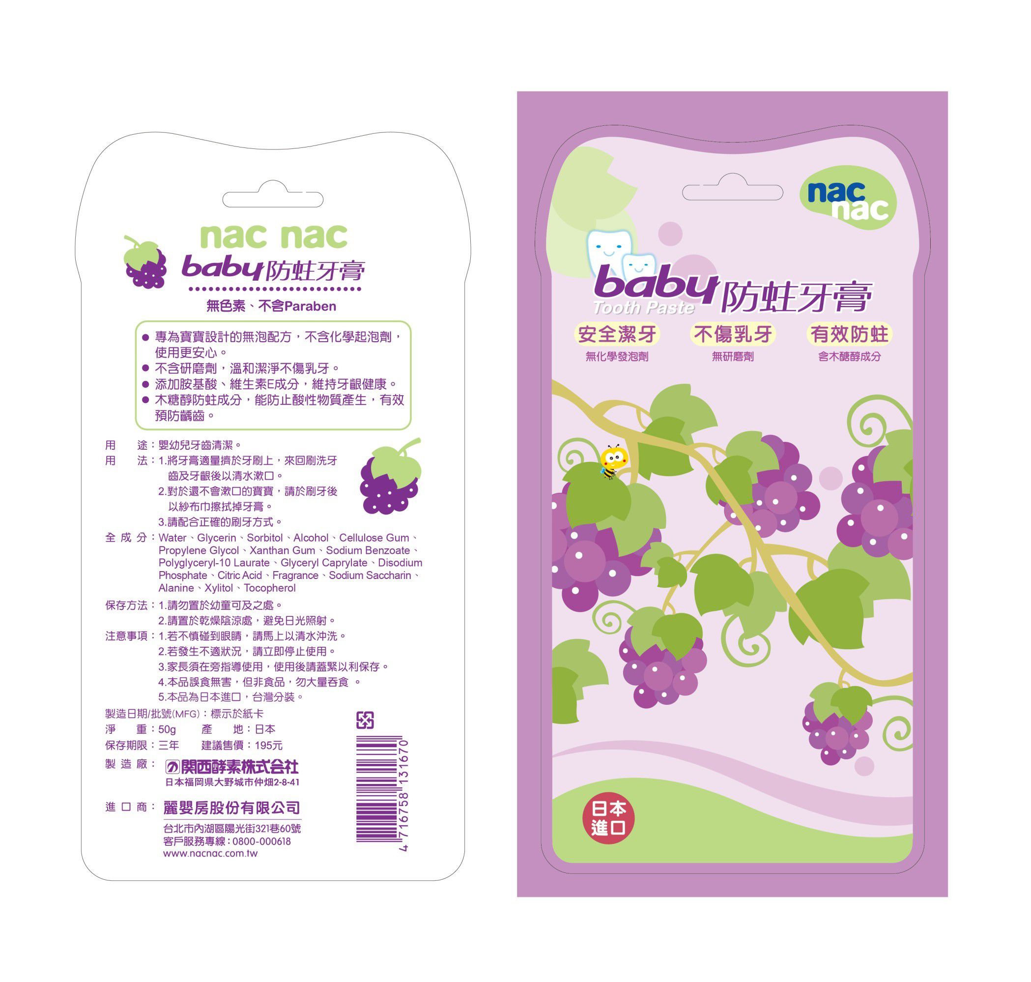 日本進口Baby防蛀牙膏葡萄口味專為6個月以上嬰幼兒所設計,100%食品用料,寶寶誤食無害,溫和潔淨的配方添加胺基酸、維生素E成分,維持牙齦健康~含木糖醇,能防止酸性物質產生,有效預防齲齒唷!不含研磨劑,不傷害寶寶新生的乳牙,非常適合拿來教寶寶如何自己刷牙~只要將牙膏適量擠於牙刷上,配合正確的刷牙方式,來回刷洗牙齒及牙齦後以清水漱口即可喔~ 對於還不會漱口的寶寶,請於刷牙後以紗布巾擦拭掉牙膏^^