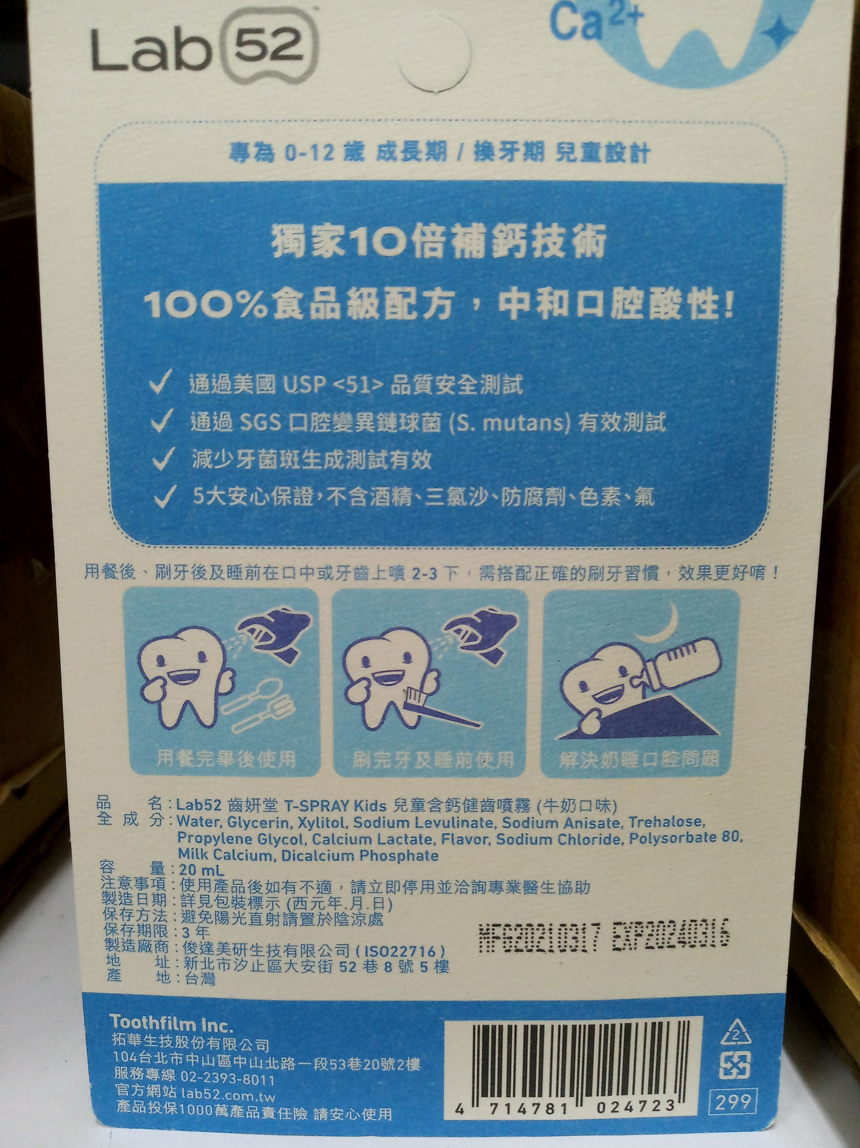 使用方法:用餐完畢後、刷牙後以及睡前輕輕在嘴裡噴2-3下,小孩牙齒好健康