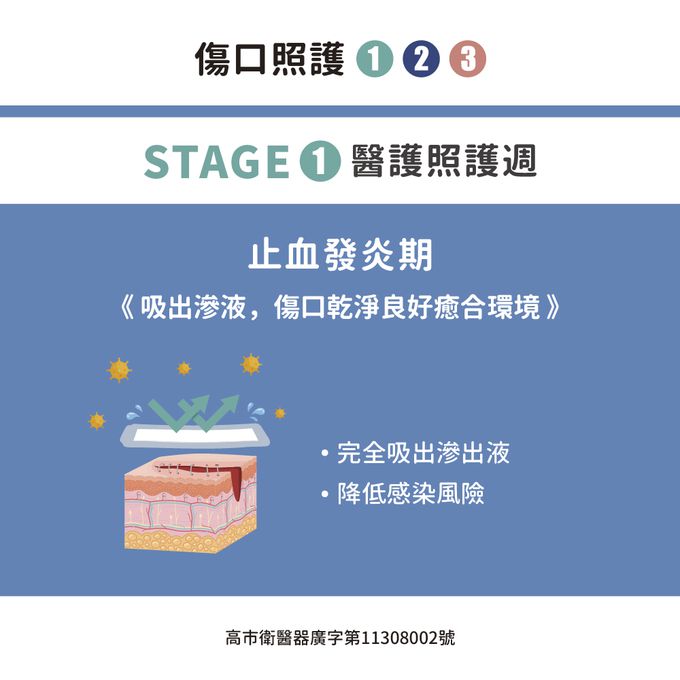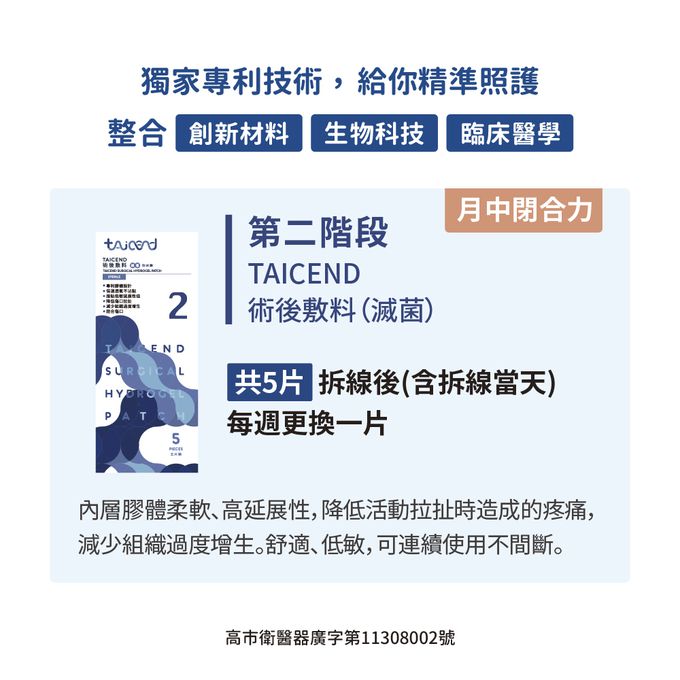 9. 使用 TAICEND 術後敷料時,可洗澡,但敷料邊緣需加壓與皮膚密合完整,以免水分滲入造成透濕,若有水分滲入請更換敷料。