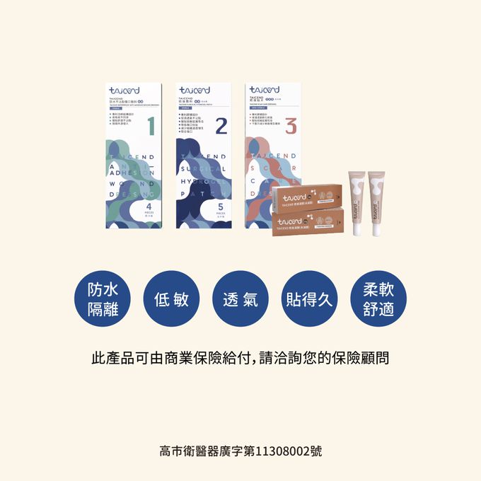 9. 使用 TAICEND 術後敷料時,可洗澡,但敷料邊緣需加壓與皮膚密合完整,以免水分滲入造成透濕,若有水分滲入請更換敷料。