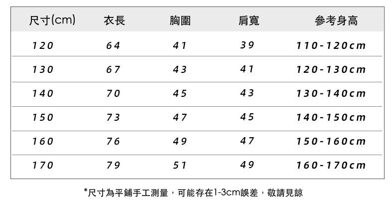 1. 尺寸表單位皆為公分(cm)、水平測量,會因布料彈性、水洗處理、測量起訖點等因素, 與實際商品尺寸略有誤差