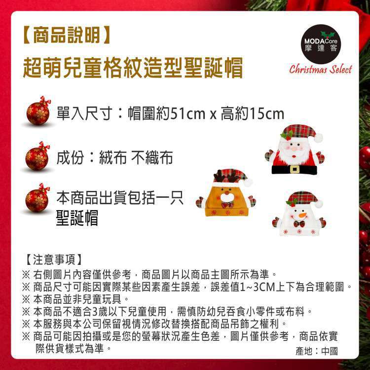 MODACore 摩達客 - 摩達客耶誕派對-超萌兒童格紋造型聖誕帽(麋鹿款)