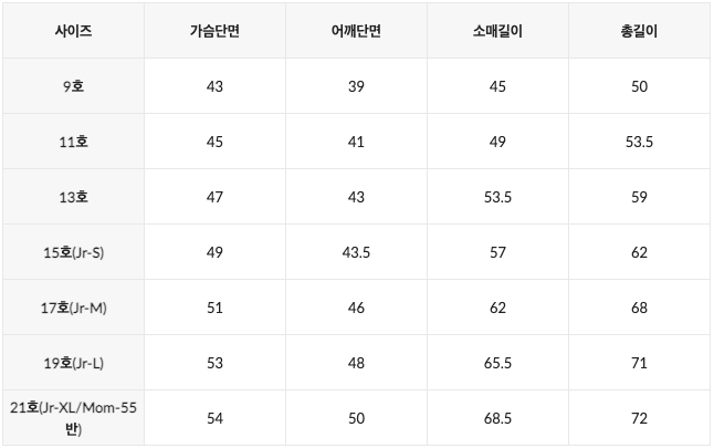 尺寸表由左至右為:尺寸、胸寬、肩寬、袖長、總長