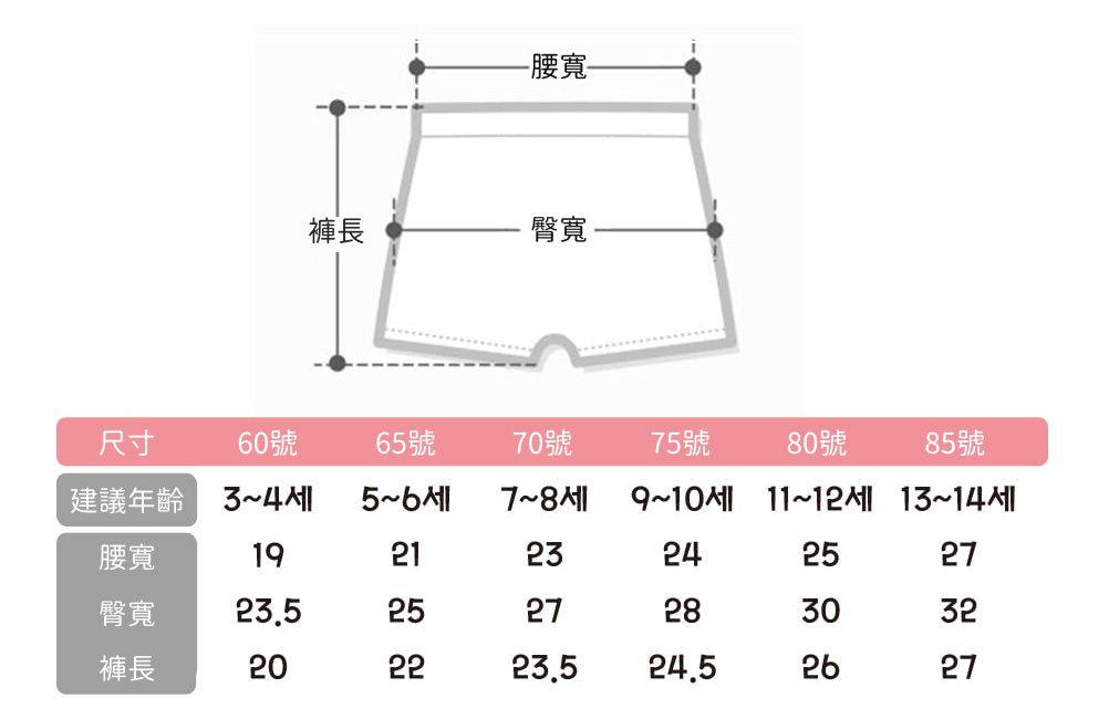 60號[3-4Y]、65號[5-6Y]、70號[7-8Y]、75號[9-10Y]、80號[11-12Y]、85號[13-14Y]