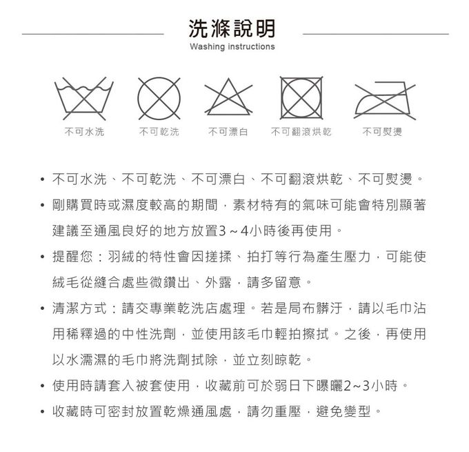 保養方式:剛買時或濕度較高的期間,羽絨特有的氣味可能會特別顯著