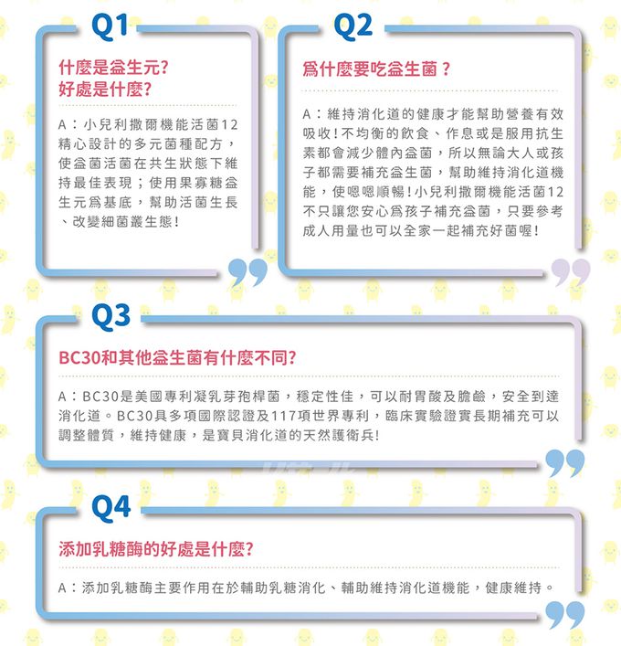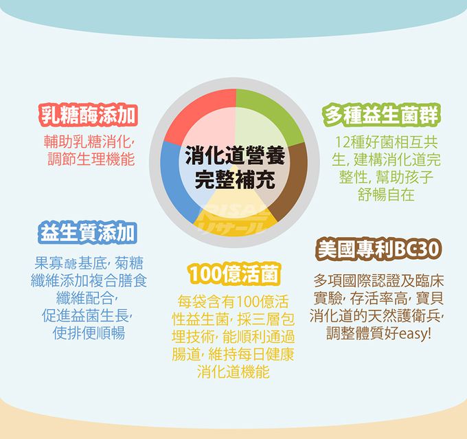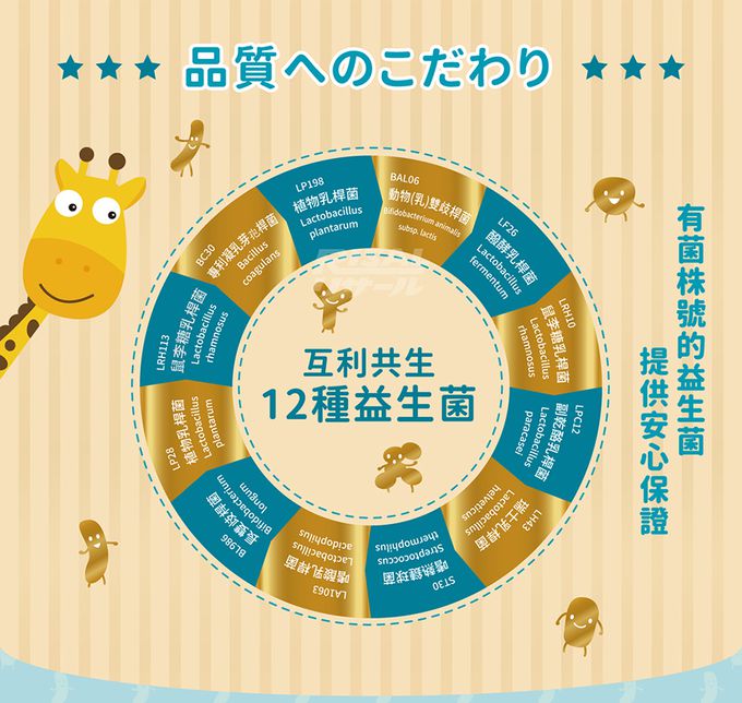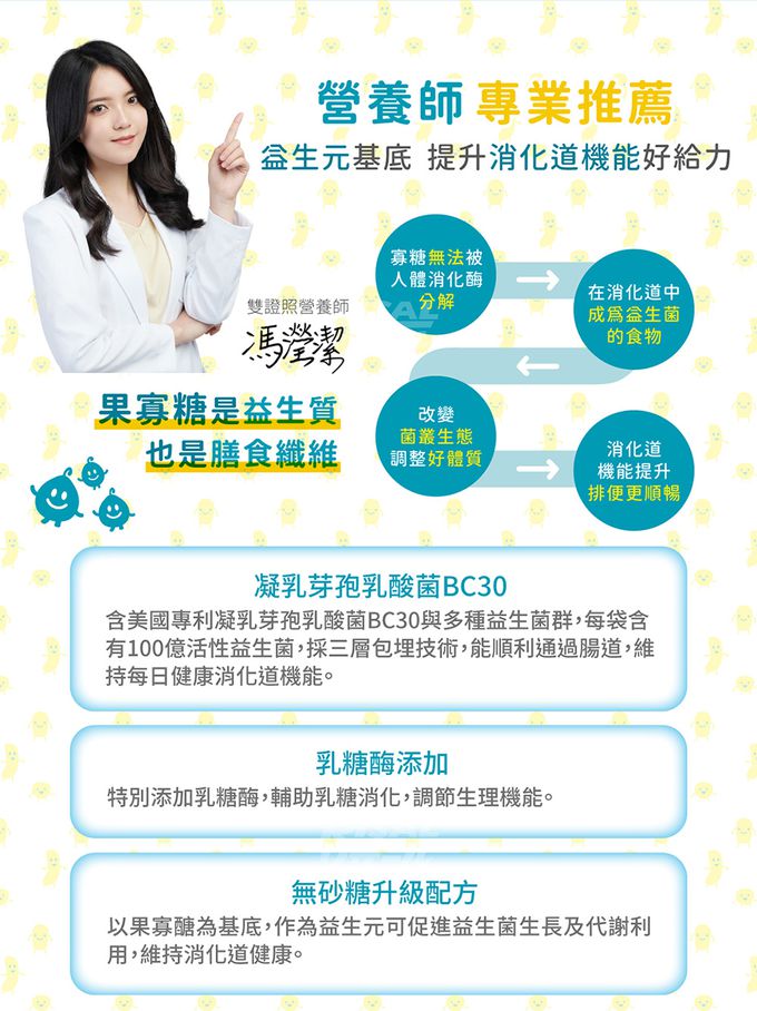 成分:果寡醣粉(非基改玉米澱粉、果寡醣)、山梨醇(甜味劑)、微結晶狀α-纖維素、乳酸菌(植物乳桿菌LP198、凝乳芽孢桿菌BC30、植物乳桿菌LP28、鼠李糖乳桿菌LRH113、長雙歧桿菌BL986、動物(乳)雙歧桿菌BAL06、嗜酸乳桿菌 LA1063、醱酵乳桿菌LF26、鼠李糖乳桿菌LRH10、副乾酪乳桿菌LPC12、瑞士乳桿菌LH43、嗜熱鏈球菌ST30)、菊糖、乳糖酶、蘋果酸、香料