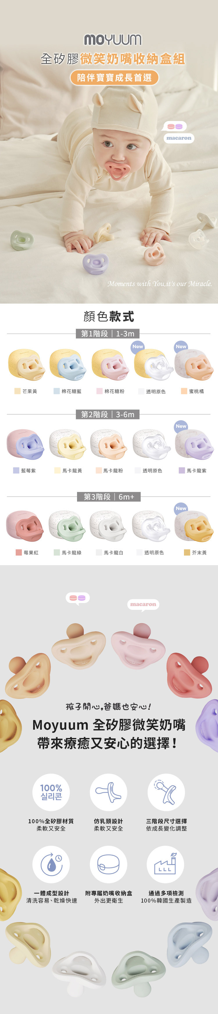 MOYUUM 韓國 全矽膠微笑奶嘴收納盒組粉嫩的馬卡龍色系,搭配實用的功能性深受媽咪寶寶喜愛,成為育兒時尚新配件!