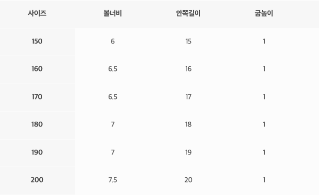 韓文由左至右為:尺寸、鞋寬、腳長、跟高
