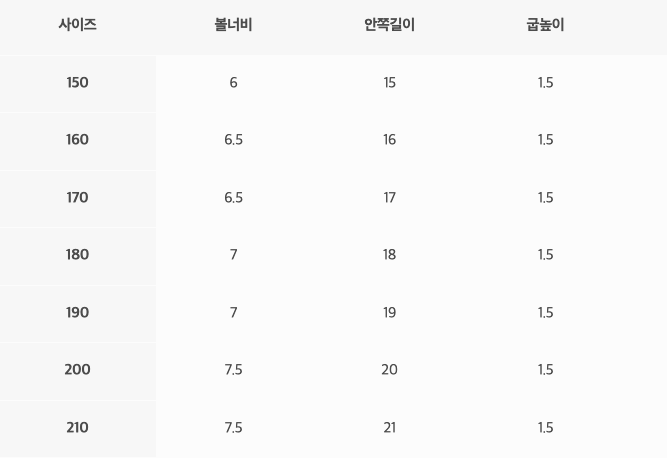 韓文由左至右為:尺寸、鞋寬、腳長、跟高