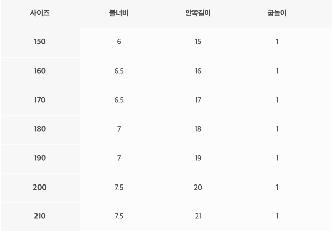 韓文由左至右為:尺寸、鞋寬、腳長、跟高
