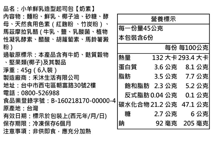 成分:麵粉、鮮乳、椰子油、砂糖、酵母、天然食用色素(仙人掌果粉、竹炭)、馬茲摩拉乳酪