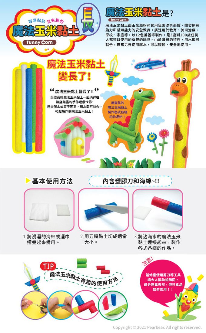 玉米黏土成分採用天然澱粉&食用色素,利用澱粉遇水即產生黏性的特點,把黏土輕輕在海綿墊上沾水,讓一顆顆黏土無需其他工具就可以相互黏牢!加上柔軟的材質可以輕鬆揉捏塑形,讓孩子可以輕鬆創作出各種平面&立體的創意作品,激發無限的想像力跟創造力!(小提醒:海綿墊只需要稍微過水,讓其有點水分即可~也不可把黏土直接沾水,有可能會融化呦!)
