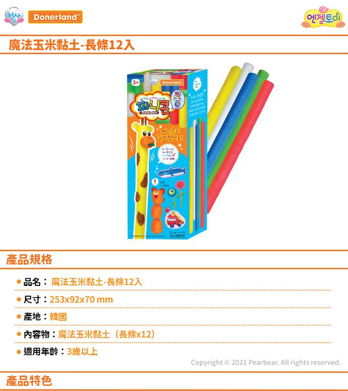 韓國 Donerland - 魔法玉米黏土-長條12入-工具刀*1+吸水海棉墊*1